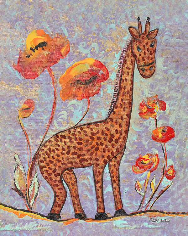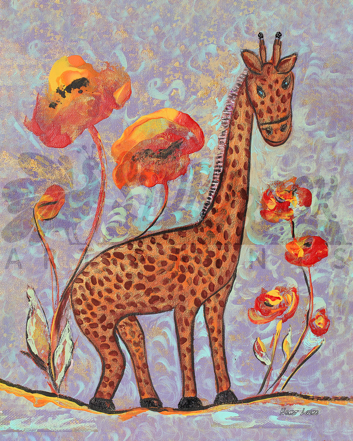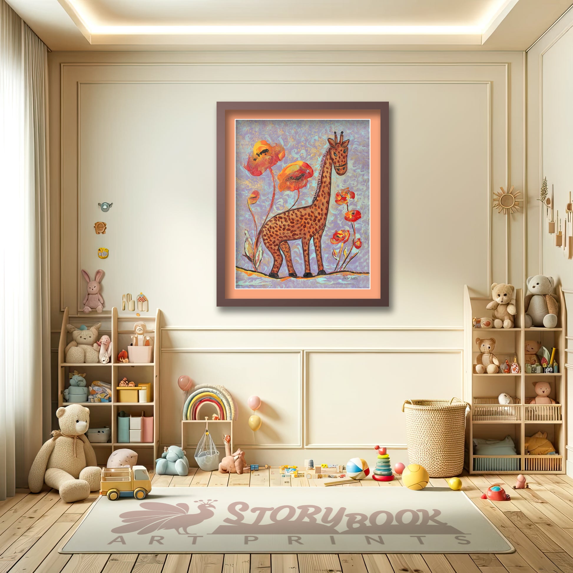 Elevate your home decor with "Bashful Heights" by Nemo Laine, a charming art print that captures the whimsical beauty of nature. Featuring a bashful giraffe amidst vibrant orange flowers, this piece adds a touch of playful elegance to any space. Perfect for art lovers and cultural enthusiasts, this fine art giclee print brings a sense of joy and wonder into your living environment.